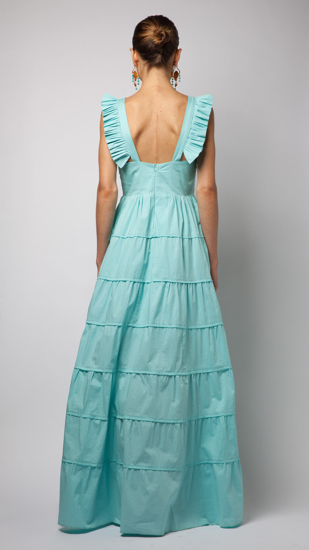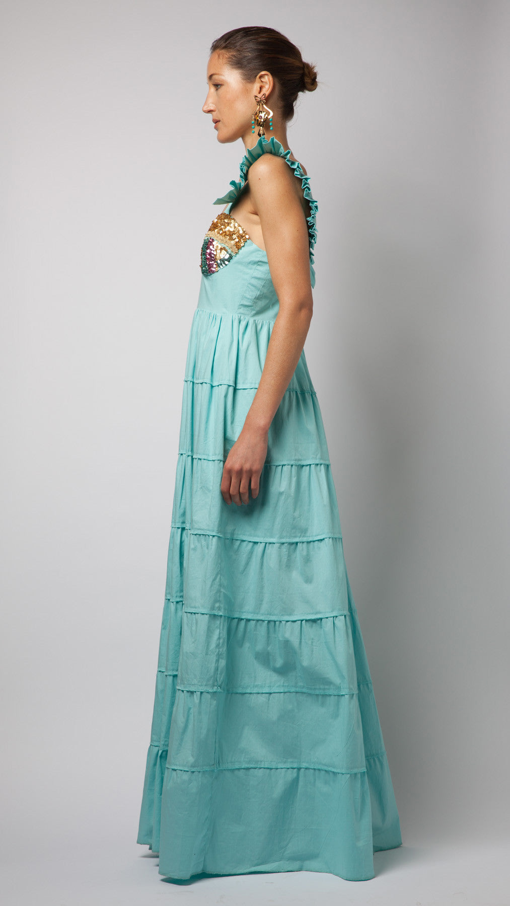 Turquoise Ruffle Sequin Embellished Cotton-Poplin Dress